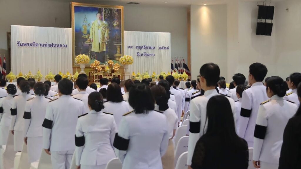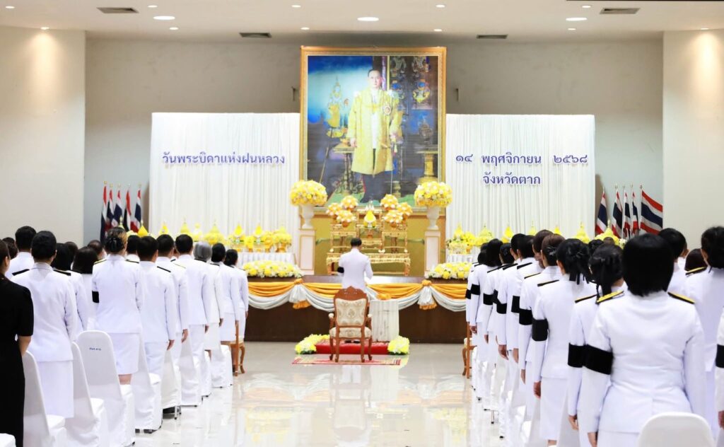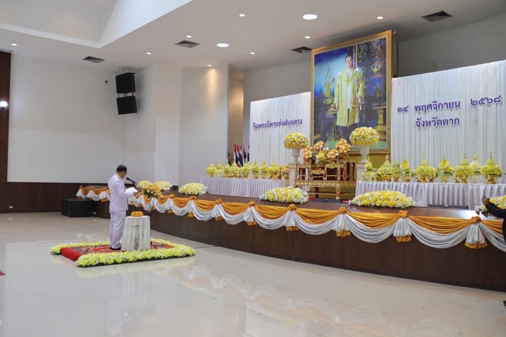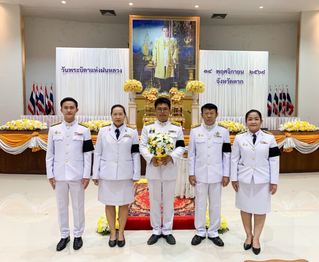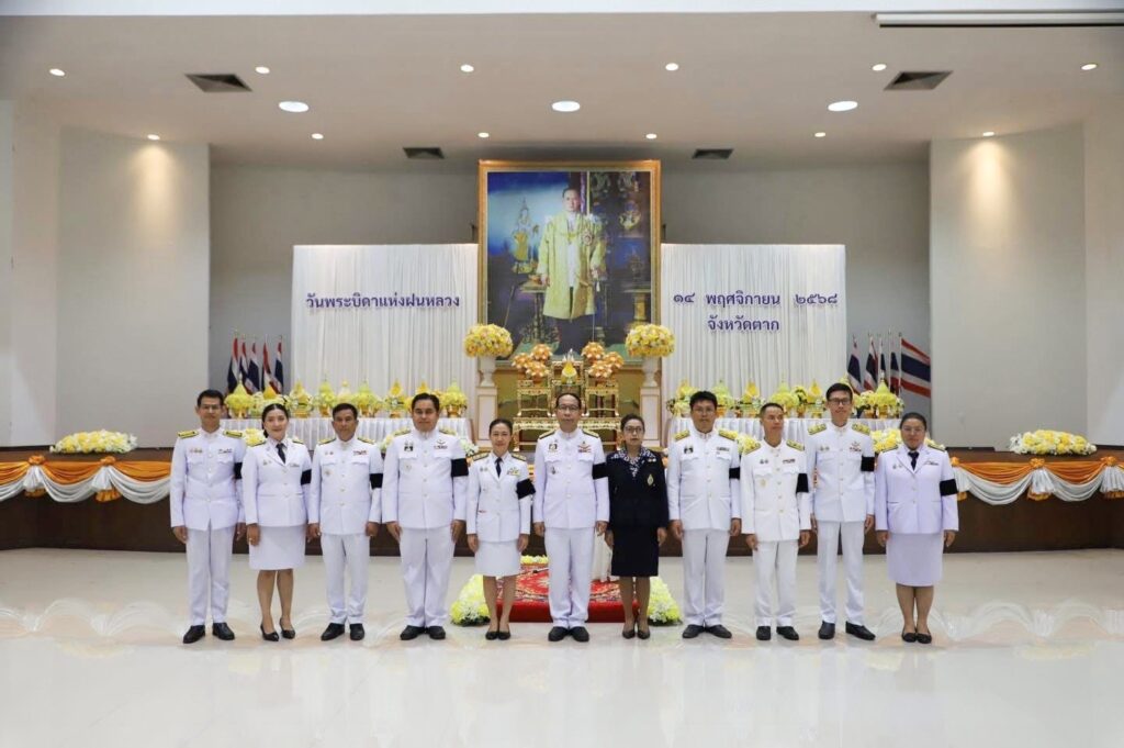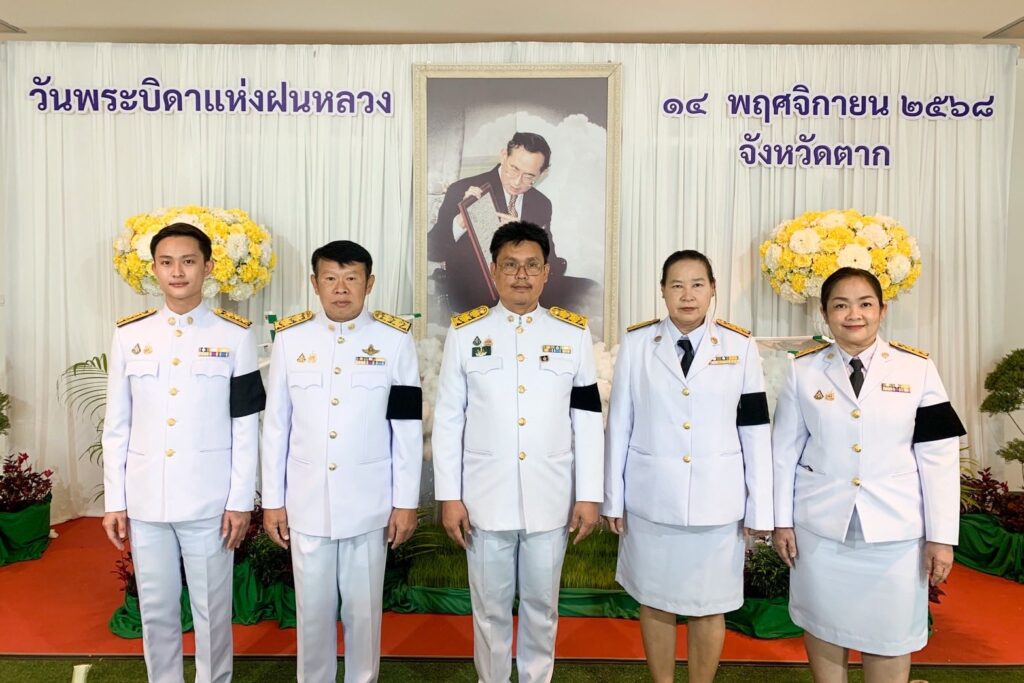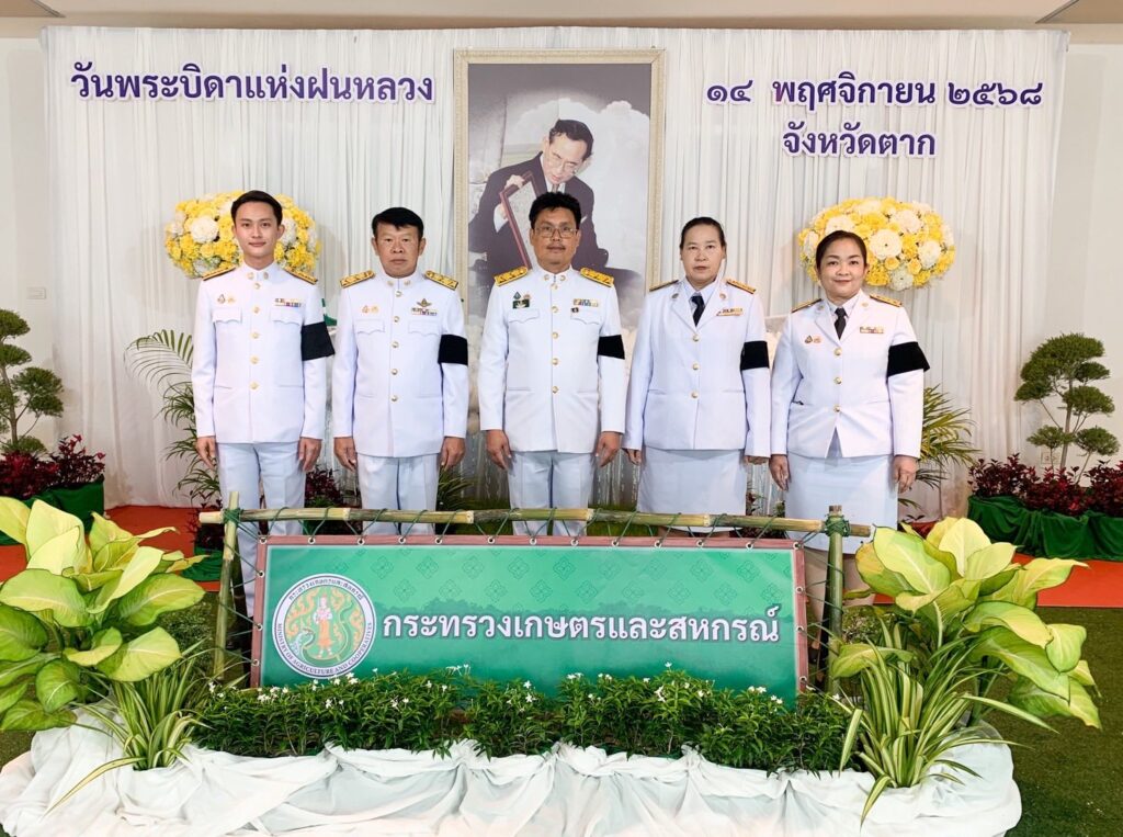 วันที่ 14 พฤศจิกายน 2568 นายวิษณุ คำพินิจ เกษตรจังหวัดตาก พร้อมด้วย นายบุญนำ ภูมิประเทศ หัวหน้าฝ่ายบริหารทั่วไป และเจ้าหน้าที่ฝ่ายบริหารทั่วไป เข้าร่วมพิธีวางพานพุ่มดอกไม้สดถวายราชสักการะ น้อมรำลึกในพระมหากรุณาธิคุณ พระบาทสมเด็จพระบรมชนกาธิเบศร มหาภูมิพลอดุลยเดชมหาราช บรมนาถบพิตร เนื่องในวันพระบิดาฝนหลวง ประจำปี 2568 ณ หอประชุมจังหวัดตาก ศาลากลางจังหวัดตาก โดยมี นายชูศักดิ์ รู้ยิ่ง ผู้ว่าราชการจังหวัดตาก เป็นประธานในพิธี