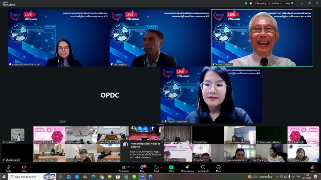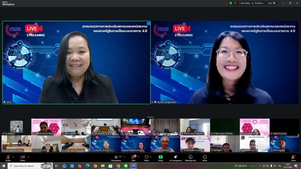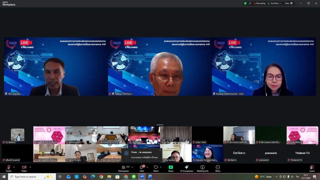 ระหว่างวันที่ 21 – 22 มกราคม 2569 นายวิษณุ คำพินิจ เกษตรจังหวัดตาก มอบหมายให้ นางสาวนฤมล รัตนทะวงค์ นักวิชาการส่งเสริมการเกษตรชำนาญการ กลุ่มยุทธศาสตร์และสารสนเทศ เข้าร่วมอบรมให้ความรู้เกี่ยวกับแนวทางการประเมินสถานะของหน่วยงานภาครัฐในระบบราชการ 4.0 สำหรับการประเมินผลปฏิบัติราชการ ประจำปีงบประมาณ พ.ศ. 2569 จัดโดยสำนักงาน ก.พ.ร. ทั้งนี้ เพื่อสร้างความรู้ ความเข้าใจ และส่งเสริมหน่วยงานภาครัฐยกระดับและพัฒนาองค์การสู่ระบบราชการ 4.0 ผ่านระบบออนไลน์ Zoom Meeting ณ สำนักวานเกษตรจังหวัดตาก