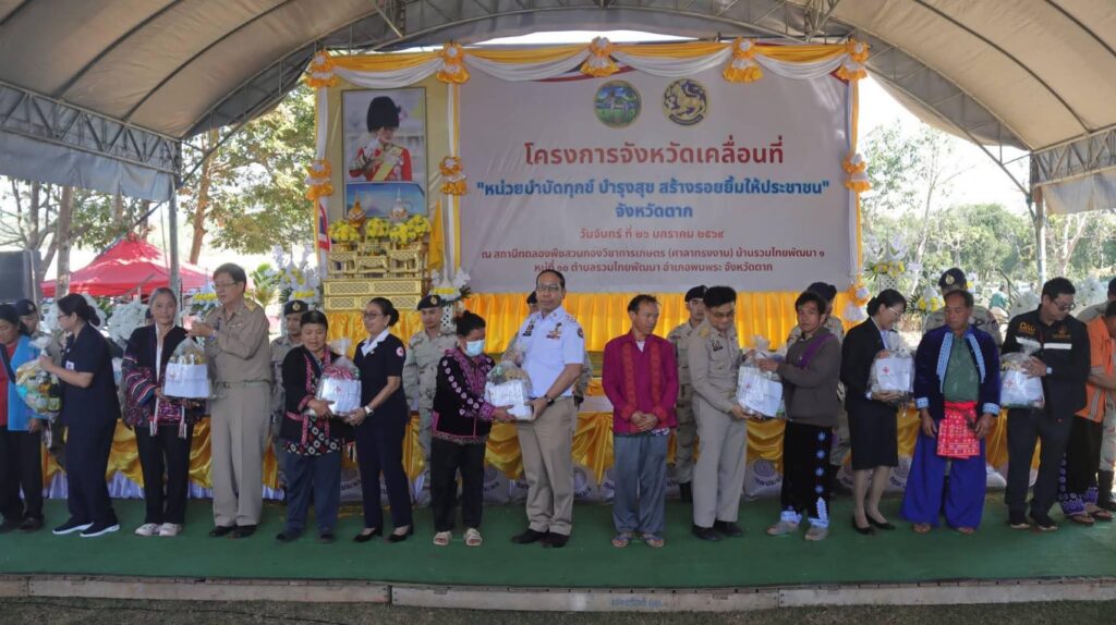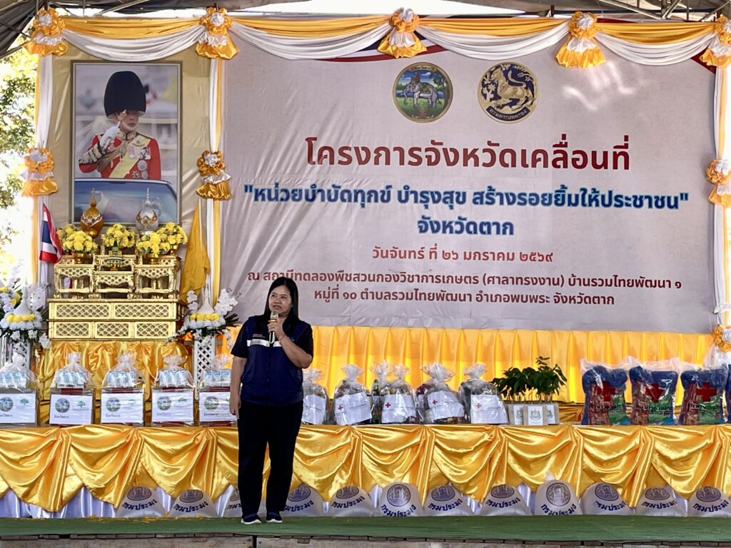 วันที่ 26 มกราคม 2569 เวลา 09.30 น. นายวิษณุ คำพินิจ เกษตรจังหวัดตาก มอบหมายให้ นางนิตยา แก้วสุข หัวหน้ากลุ่มส่งเสริมและพัฒนาเกษตรกร พร้อมด้วยเจ้าหน้าที่กลุ่มส่งเสริมและพัฒนาเกษตรกร เข้าร่วมงานจังหวัดเคลื่อนที่ “หน่วยบำบัดทุกข์ บำรุงสุข สร้างรอยยิ้มให้ประชาชน” เพื่อให้ประชาชนเข้าถึงบริการของรัฐได้อย่างสะดวกรวดเร็ว ณ สถานีทดลองพืชสวนกองวิชาการเกษตร (ศาลาทรงงาน) บ้านรวมไทยพัฒนา 1 หมู่ที่ 10 ตำบลรวมไทยพัฒนา อำเภอพบพระ จังหวัดตาก โดยมีนายชูศักดิ์ รู้ยิ่ง ผู้ว่าราชการจังหวัดตาก เป็นประธานเปิดโครงการจังหวัดเคลื่อนที่ฯ รองผู้ว่าราชการจังหวัดตาก หัวหน้าส่วนราชการระดับจังหวัด อำเภอ หัวหน้าหน่วยงานรัฐวิสาหกิจ ข้าราชการ องค์กรปกครองส่วนท้องถิ่น กำนัน ผู้ใหญ่บ้าน และประชาชนในพื้นที่ เข้าร่วมกิจกรรมฯ