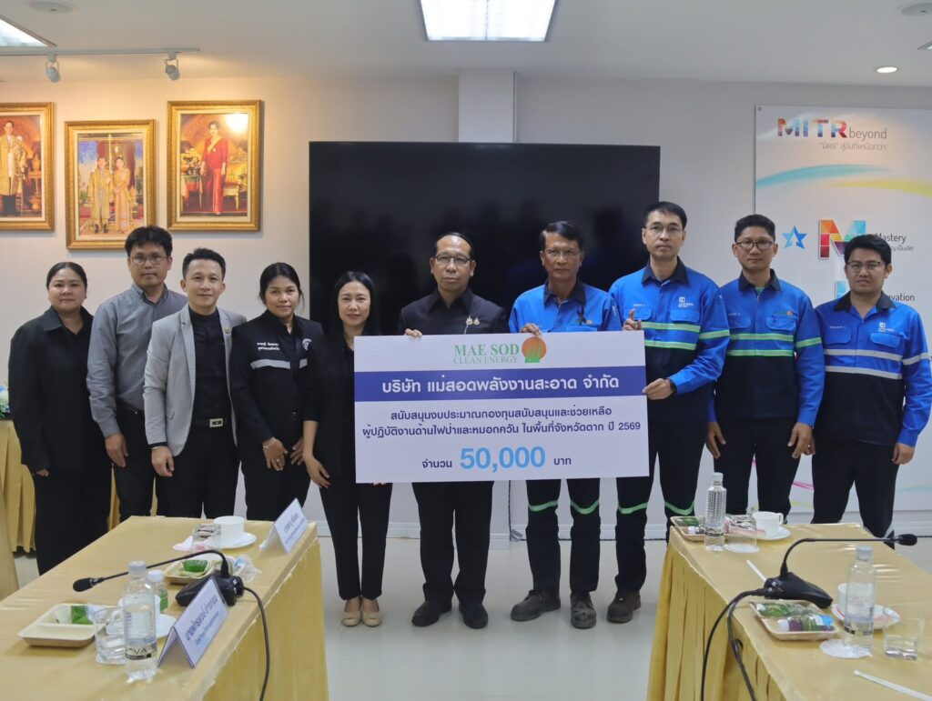 หลังจากนั้นผู้ว่าราชการจังหวัดตากได้ชมวิดีทัศน์ แนะนำโรงงานของ บริษัท แม่สอด พลังงานสะอาด จำกัด ณ ห้องประชุมแม่สอด บริษัท แม่สอด พลังงานสะอาด จำกัด พร้อมทั้งนำเสนอข้อมูลกระบวนการผลิต และการส่งเสริมสนับสนุนการลด PM 2.5 พร้อมมอบทุนสนับสนุนงบประมาณกองทุนช่วยเหลือผู้ปฏิบัติงานด้านไฟป่าเเละหมอกควัน ในพื้นที่จังหวัดตาก จำนวน 50,000 บาท