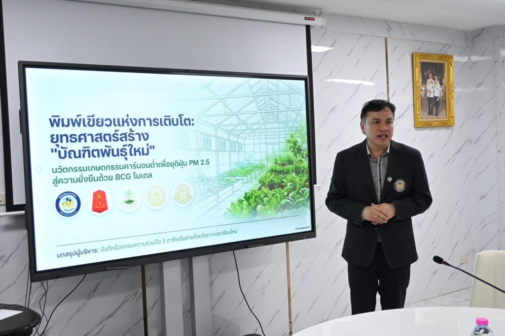 วันที่ 7 เมษายน 2569 เวลา 14.00 น. นายวิษณุ คำพินิจ เกษตรจังหวัดตาก เข้าร่วมพิธีลงนามบันทึกข้อตกลงความร่วมมือ (MOU) ทางวิชาการ ด้านการเกษตรเพื่อยกระดับการเกษตรในพื้นที่จังหวัดตาก ณ วิทยาลัยนอร์ทเทิร์น ตำบลหนองบัวใต้ อำเภอเมืองตาก จังหวัดตาก ซึ่งวิทยาลัยนอร์ทเทิร์น โดย ผู้ช่วยศาสตราจารย์ดร.ไตรรัตน์ ยืนยง อธิการบดีวิทยาลัยนอร์ทเทิร์น ได้ลงนามบันทึกข้อตกลงความร่วมมือ (MOU) ร่วมกับ พล.ต. สมบัติ บุญกอแก้ว ผู้บัญชาการมณฑลทหารบกที่ 310 นางประเทือง มหาพิรุณ เกษตรและสหกรณ์จังหวัดตาก และนายวิษณุ คำพินิจ เกษตรจังหวัดตาก เพื่อความร่วมมือในการจัดการเรียนการสอนหลักสูตรโครงการผลิตบัณฑิตพันธุ์ใหม่และพัฒนากำลังคนที่มีสมรรถนะ เพื่อตอบโจทย์ภาคการผลิตตามนโยบายการปฏิรูปการอุดมศึกษาไทย ปี พ.ศ. 2569 (หลักสูตรประเภทประกาศนียบัตรหลักสูตรใหม่ พ.ศ. 2569) โดยใช้ชื่อหลักสูตร: เกษตรกรรมคาร์บอนต่ำ เพื่อลด PM2.5 สู่การพัฒนาที่ยั่งยืน BCG Model ด้วยการเพาะปลูกพืชภายใต้โรงเรือนแบบประณีต